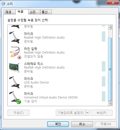 기본장치를 둘장 하나만 선택해서 기본값 설정(S)로 지정해주고 확인을 눌러주면 적용된다.