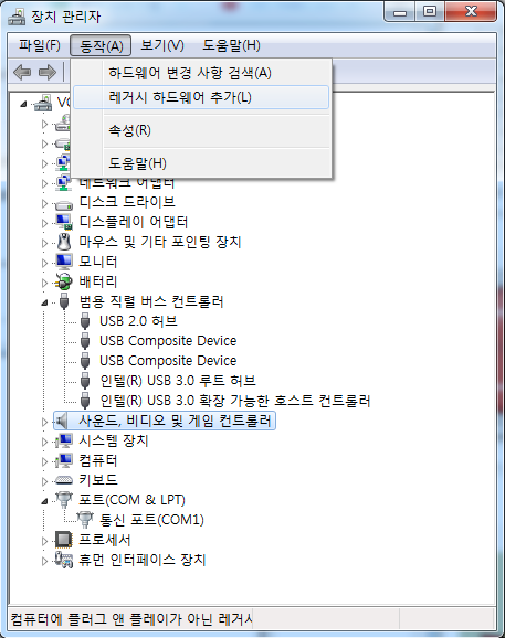사운드, 비디오 및 게임 컨트롤러를 선택하고, 레거시 하드웨어 추가를 누르자.