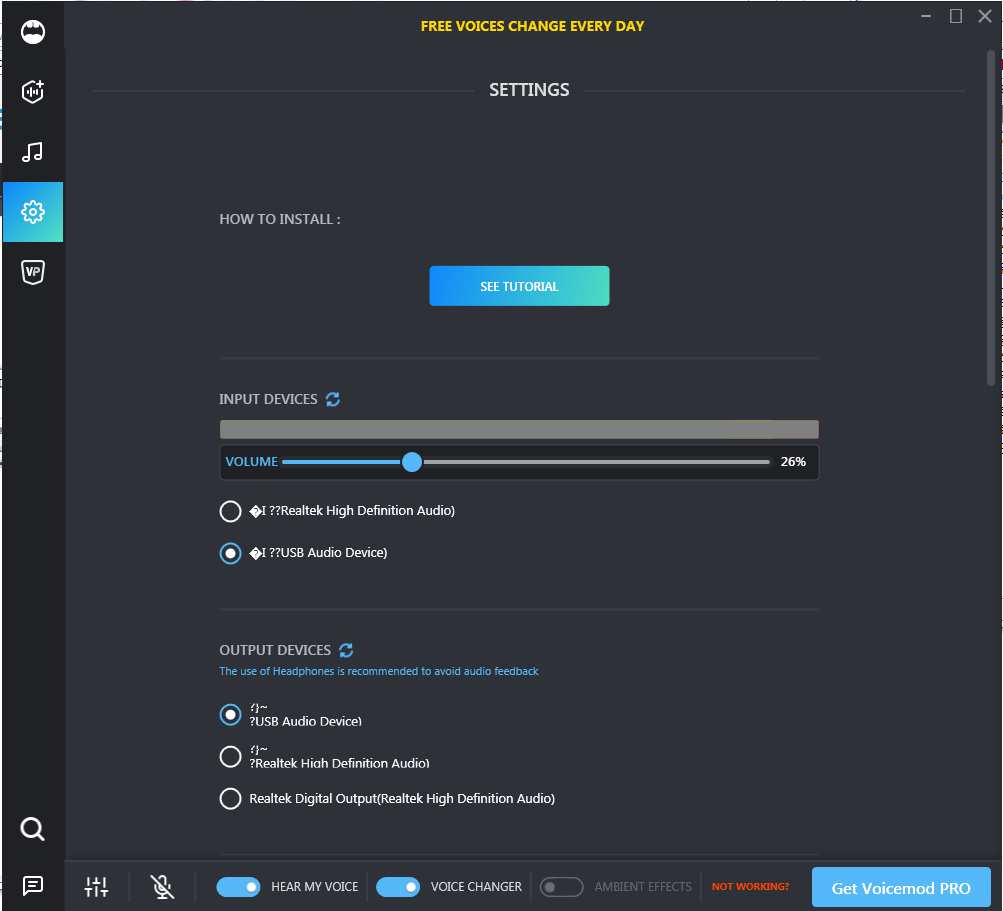 고정된 옵션들을 쭉 사용하고 싶다면 Get VoiceMod Pro를 눌러서 구매해야 ProVoices의 자물쇠가 풀립니다.