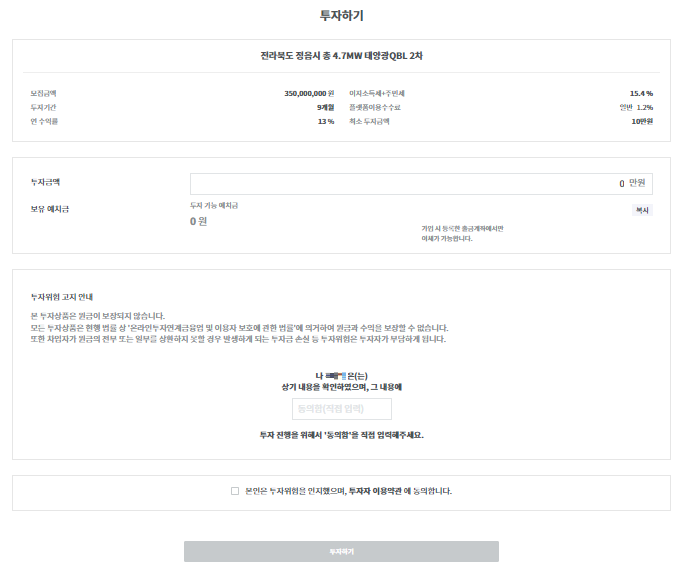 투자금 입력은 만원단위로 가능하며 최소금액은 대체로 10만원 부터이다.