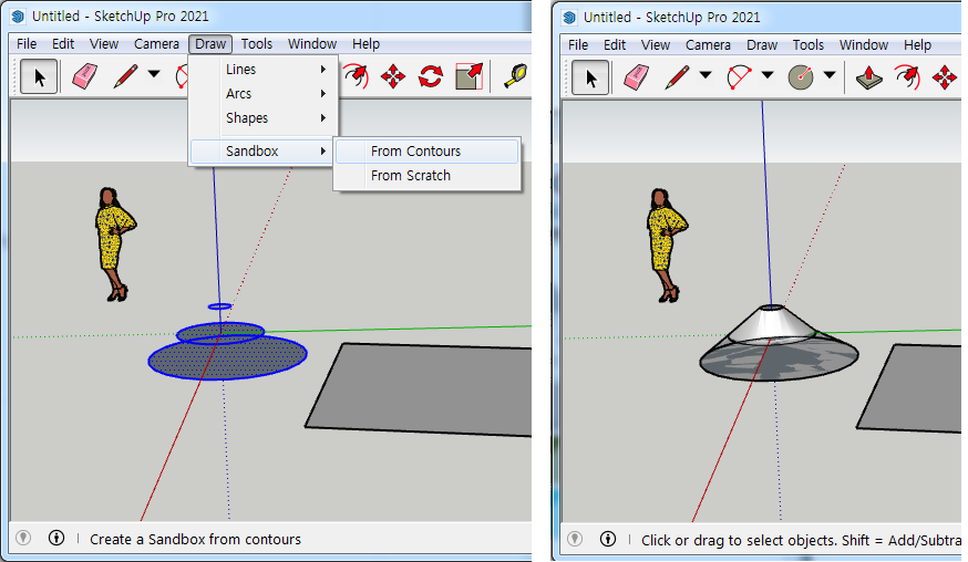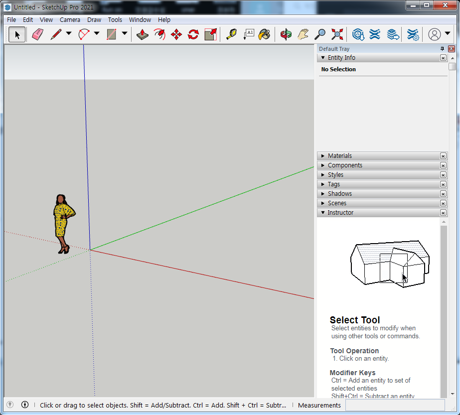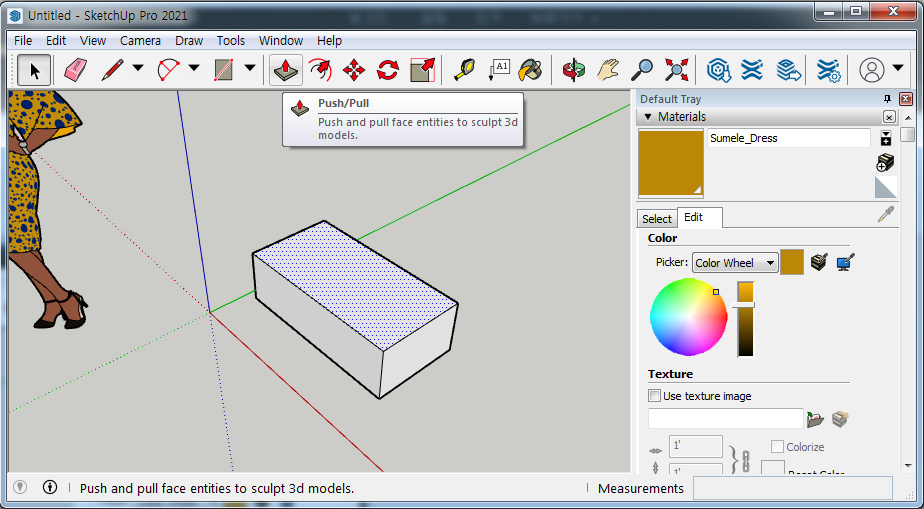 면(=Face)를 일단 만들고 push/pull 아이콘을 선택후 좌클릭후 Drag를 하면 Drag한 방향으로 면이 늘어나서 3D객체를 쉽게 만들수 있게 해준다.