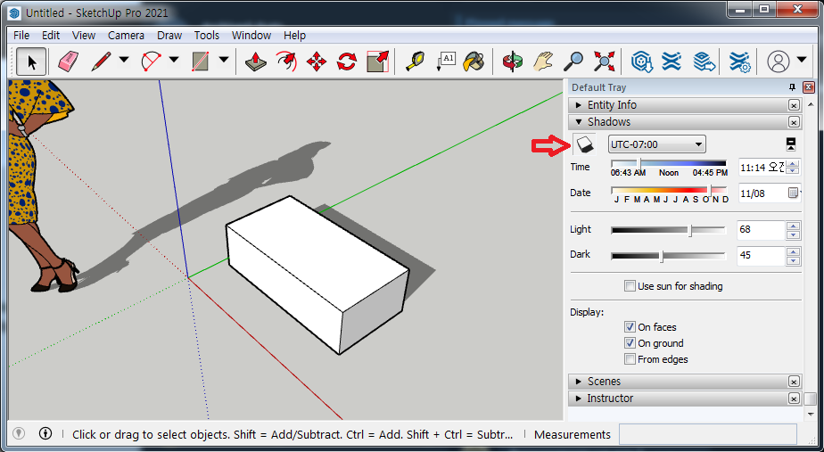 UTC 타임을 바꿔주면 시간에 따를 해의 위치에 따라 그림자의 위치가 조금씩 바뀌는 걸 볼수 있다.