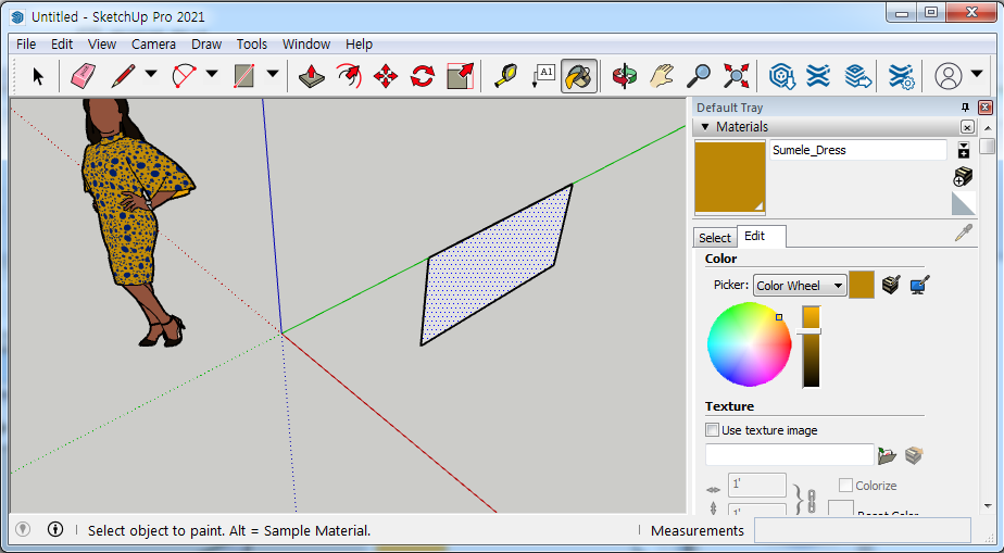 ToolBar 가장왼쪽의 SelectTool로 면을 선택해주고 Paint아이콘을 선택한후 면을 클릭해주면 된다.