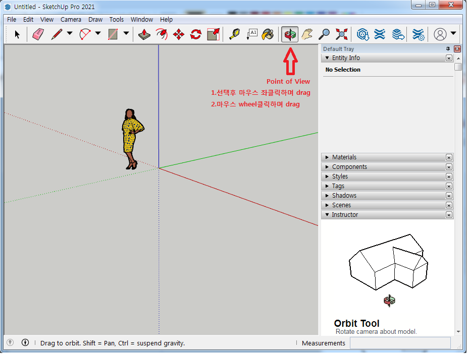 3D 공간에 있는 X축, Y축, Z축 이 있는데, 마우스휠을 누른채로 이리저리 Drag를 하다보면 축을 중심으로 이미지가 회전하는걸 확인할 수 있다.