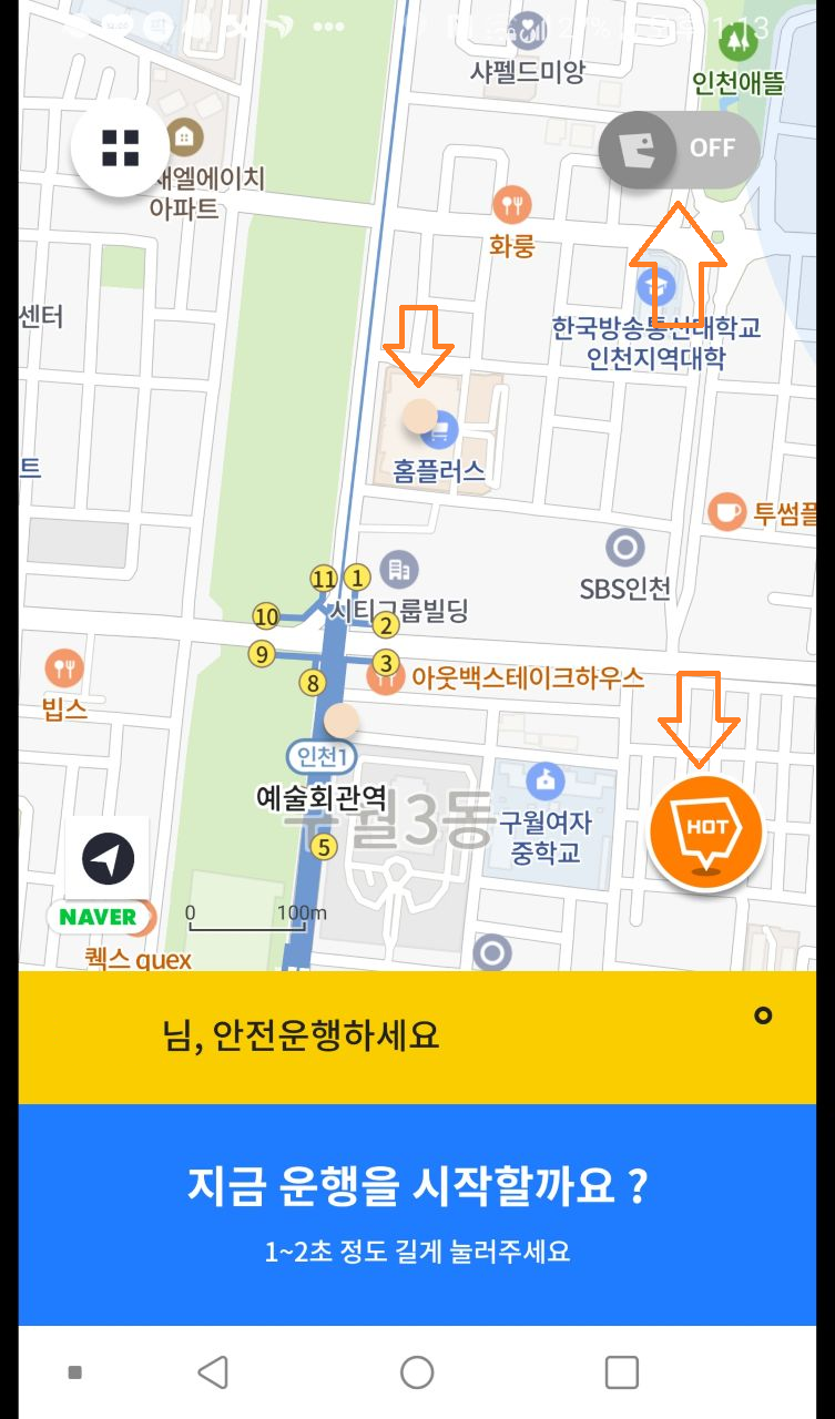 지금운행을 시작할까요 << 버튼을 꾹 누르거나 , 우측상단의 ON/OFF 버튼을 눌러주면 시작됩니다.