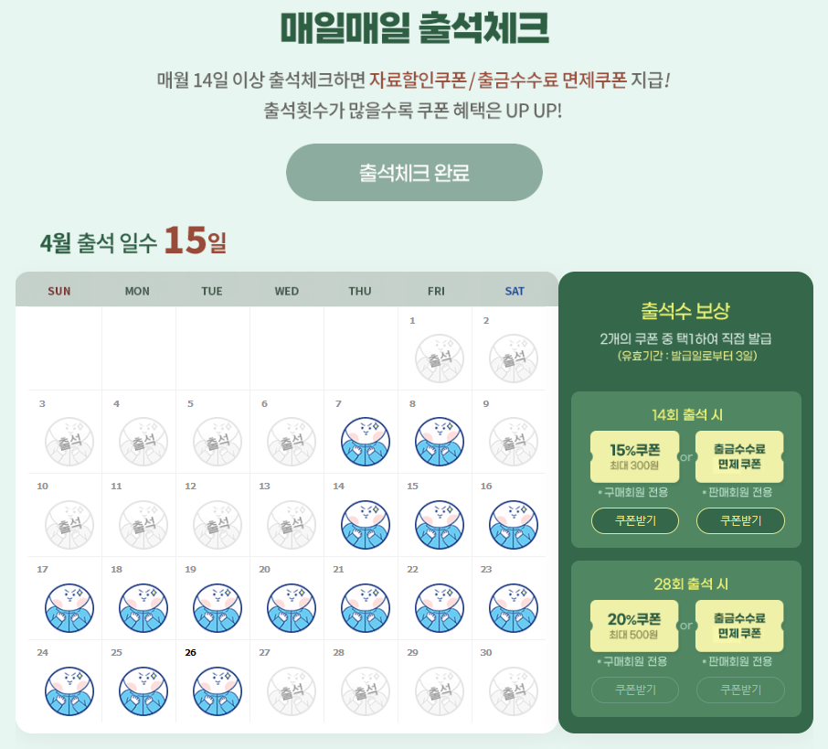 판매자회원일 경우 출금수수료 면제 쿠펀을 얻기위해선 14회 출책을 하면 쿠폰이 발급됩니다.