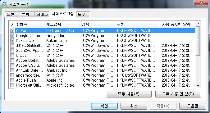 msconfig 를 써서 모두 Disable상태로 만들고 컴퓨터 껐다 키는걸 우선 추천한다.