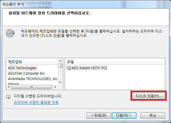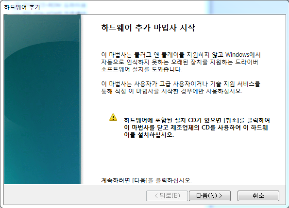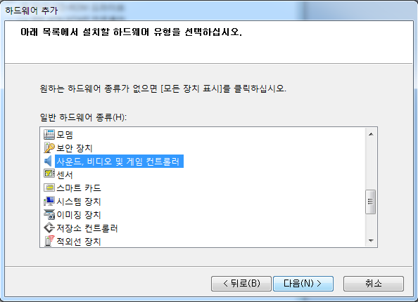 사운드, 비디오 및 게임 컨트롤러를 선택하고, 레거시 하드웨어 추가를 누르자.