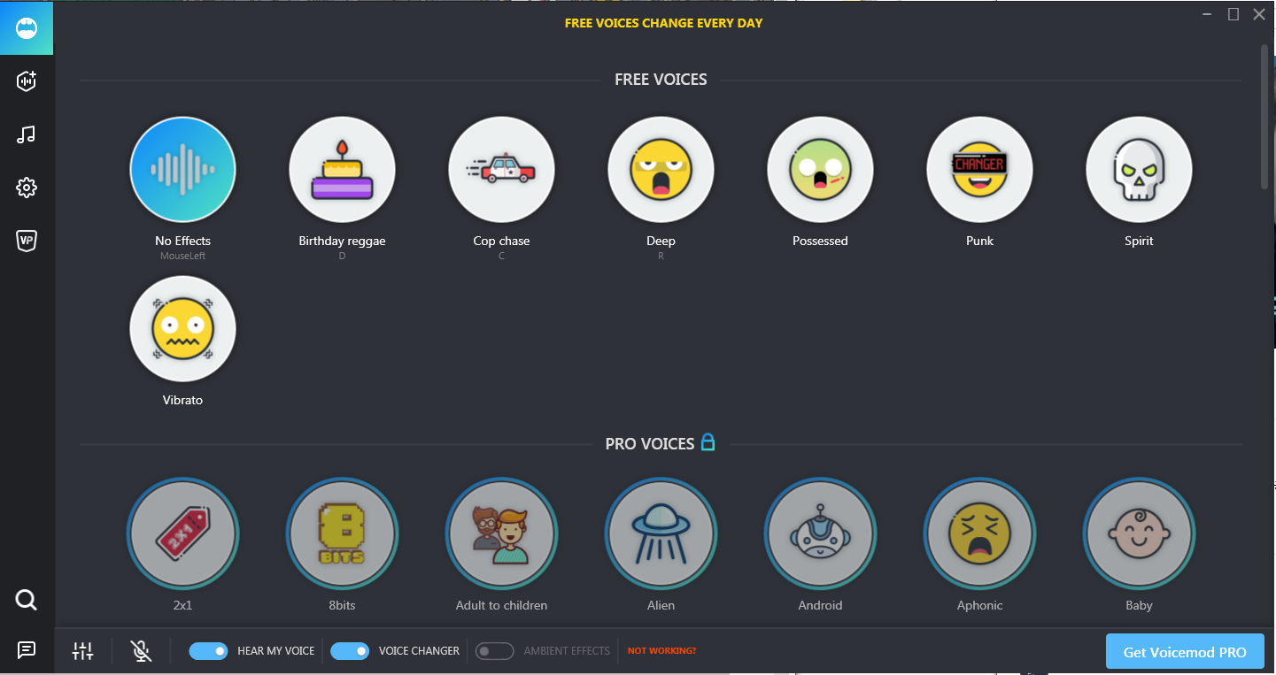 고정된 옵션들을 쭉 사용하고 싶다면 Get VoiceMod Pro를 눌러서 구매해야 ProVoices의 자물쇠가 풀립니다.