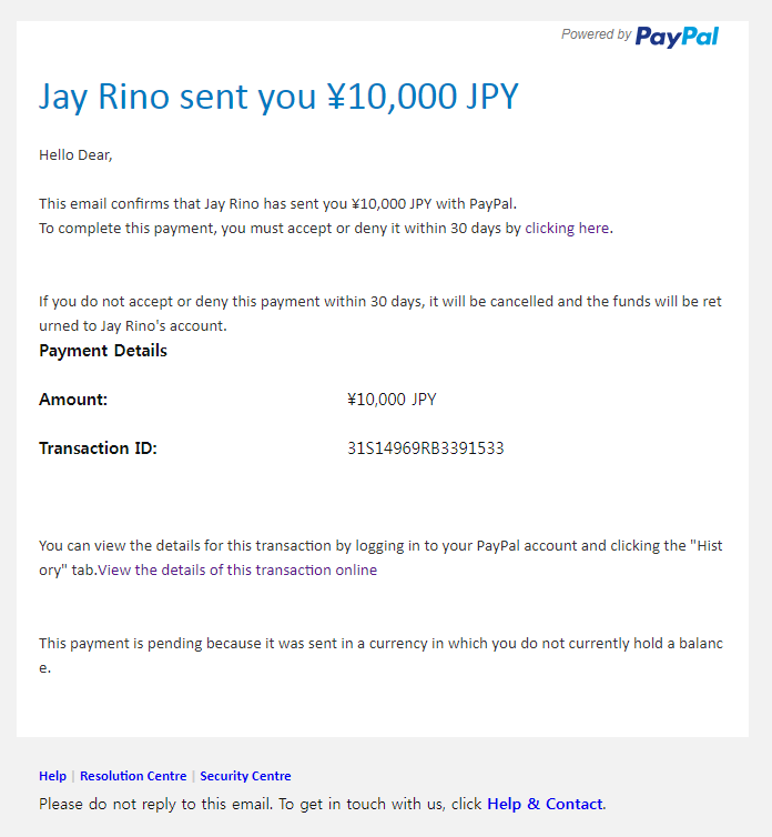 Jay Rino라는 착하신 분이 내게 10,000JPY를 보냈다고한다.