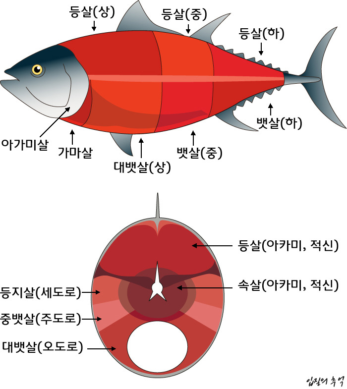 전반적으로 붉은살일수록 비싼부위이고, 무른부위 일수록 비싼 부위이다.