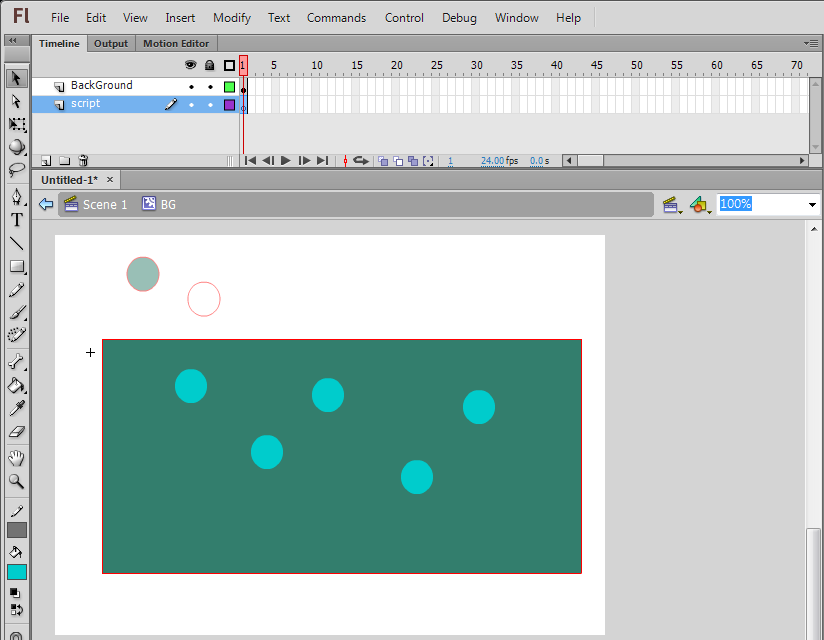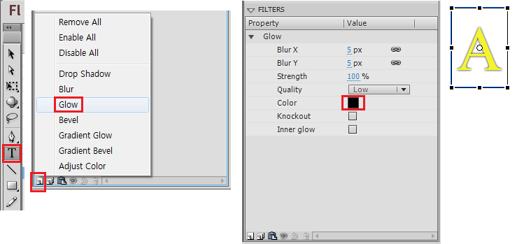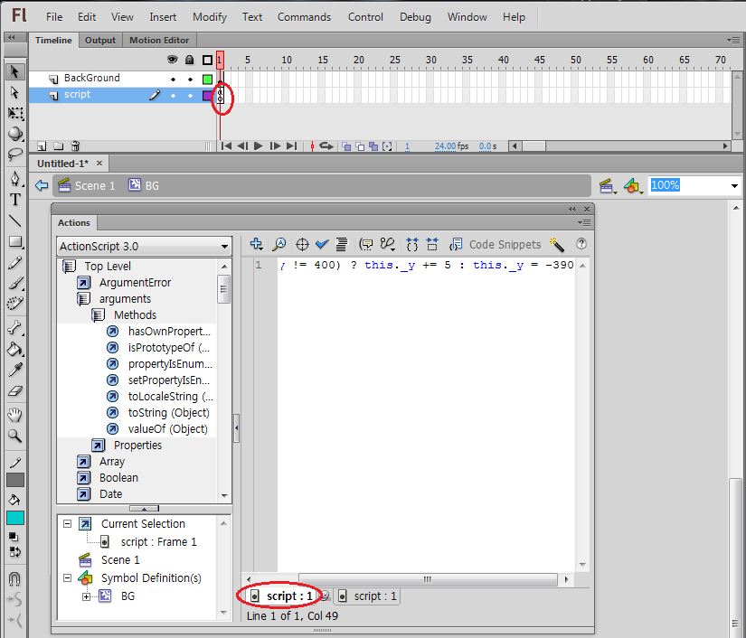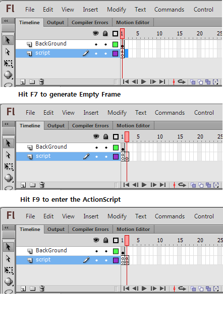 script 레이어의 첫번째 Frame에 a라고 표시되있다면 action script가 올바르게 적용됬음을 의미한다.