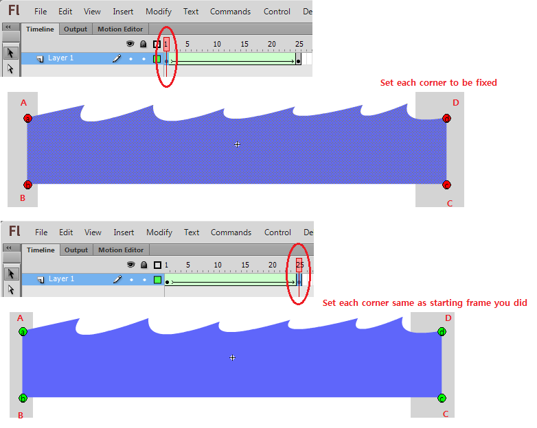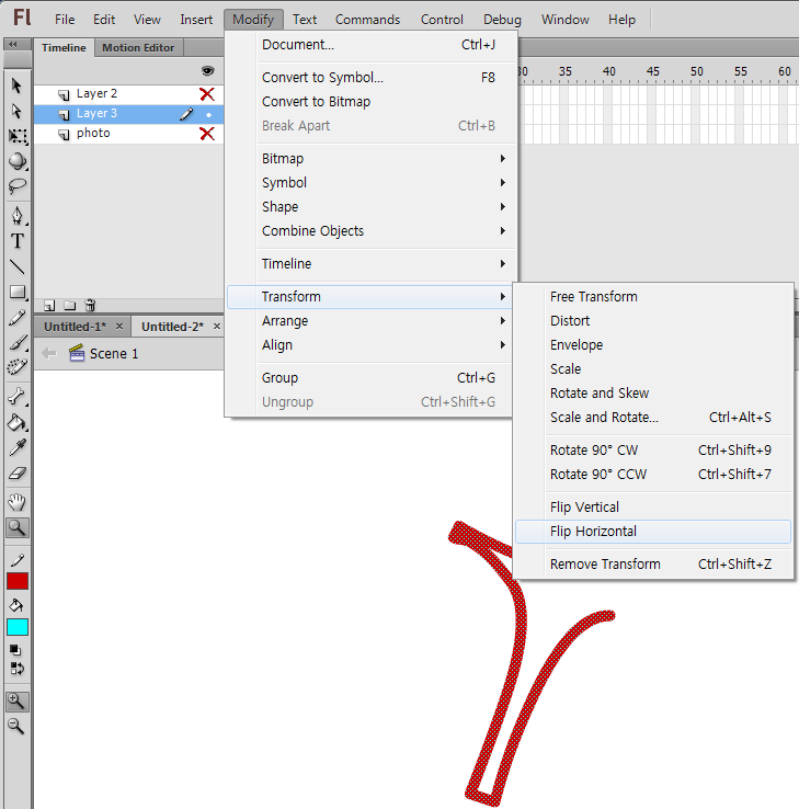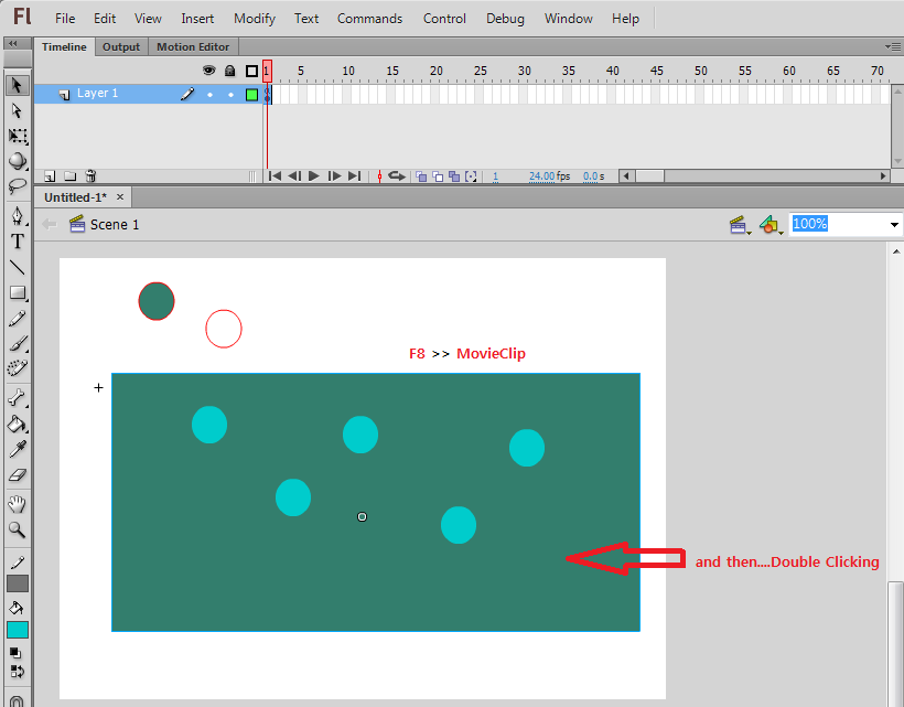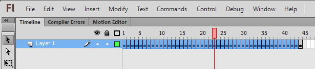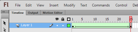 더블클릭으로 Symbol속으로 들어간 상태에서 25th Frame쯤에 Insert KeyFrame을 넣어주고 Shape Tween을 해준다.