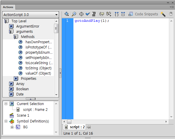 script 레이어의 첫번째 Frame을 선택하고 F9를 눌러서 코드창을 띄워준다.